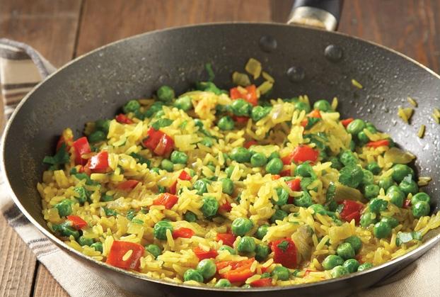 Σε ένα τηγάνι ζεσταίνουμε το ελαιόλαδο και όταν κάψει προσθέτουμε τα λαχανικά. Σοτάρουμε ανακατεύοντας συχνά, μέχρι να μαραθούν και να μαγειρευτούν όλα, περίπου 10-15 λεπτά. Προσθέτουμε αλάτι και πιπέρι και ανακατεύουμε. Προσθέτουμε το βρασμένο ρύζι στο τηγάνι με τα λαχανικά και ανακατεύουμε ώστε να κατανεμηθούν ομοιόμορφα. Σερβίρουμε όσο είναι ακόμη ζεστά.