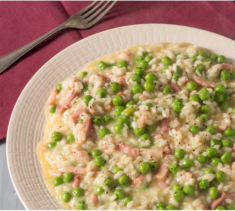 Χαμηλώνετε τη θερμοκρασία και προσθέτετε τον ζωμό, λίγο-λίγο, ανακατεύοντας και μέχρι να απορροφηθεί όλος. Μόλις μαλακώσει ελαφρά το ρύζι, κόβετε σε λεπτές φέτες το κοτόπουλο, το προσθέτετε στο τηγάνι μαζί με τον αρακά, το αφήνετε να ζεσταθεί καλά, πασπαλίζετε την παρμεζάνα και σερβίρετε.