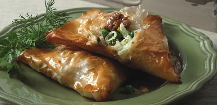 Στη συνέχεια παίρνουμε τα φύλλα μπακλαβά, τα κόβουμε στη μέση, τα βουτυρώνουμε, στρώνουμε πάνω το κρέας, βάζουμε κομματάκια κεφαλοτύρι, ρίχνουμε λίγο βούτυρο λιωμένο στο φύλλο και το τυλίγουμε.