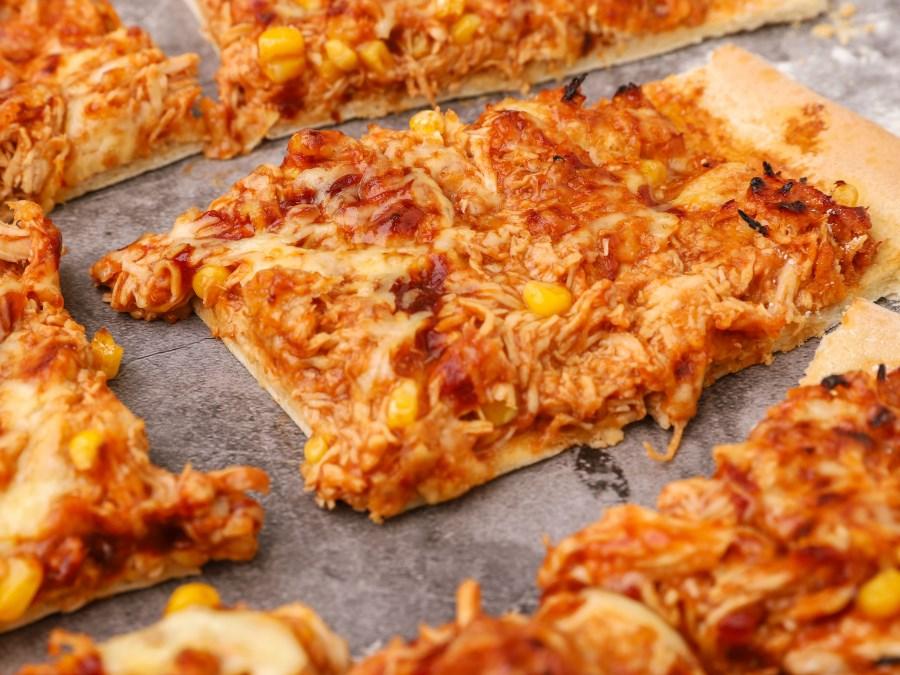 Προετοιμάστε τη σχάρα για άμεσο μαγείρεμα σε μέτρια φωτιά με θερμοκρασία σχάρας στους 175-230 °C. Βάλτε την κεραμική επιφάνεια για πίτσα να ζεσταθεί, για τουλάχιστον 10 λεπτά. Μεταφέρετε τη ζύμη σε μια ελαφρά αλευρωμένη επιφάνεια εργασίας και ανοίξτε την. Τοποθετήστε τη ζύμη με τη βοήθεια ενός κομματιού αντικολλητικού χαρτιού ψησίματος πάνω στη ζεστή πλάκα. Ψήστε τη ζύμη με το καπάκι κλειστό, όσο το δυνατόν περισσότερο, 2-3 λεπτά. Ρίξτε τη μπάρμπεκιου σως και απλώστε την σε όλη την επιφάνεια του ζυμαριού.