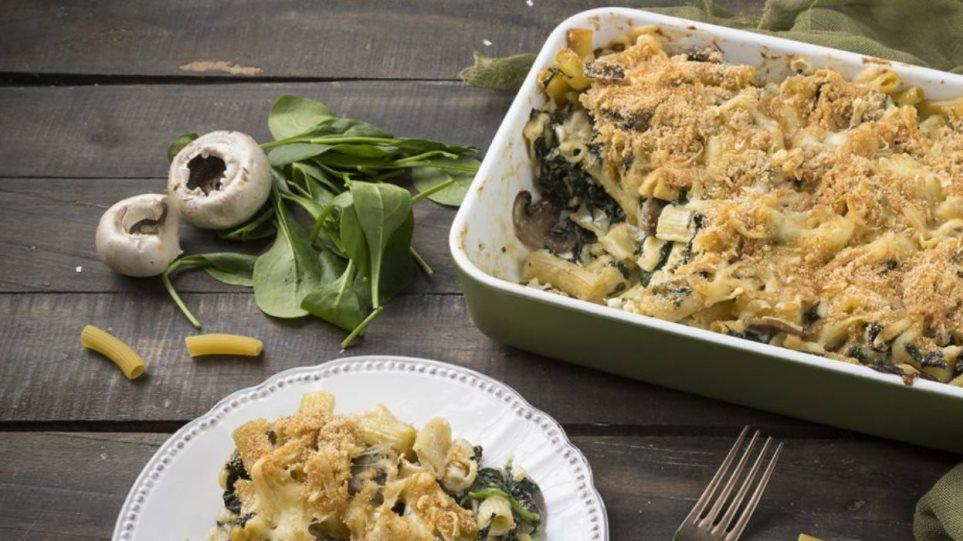 Σουρώνουμε τα ζυμαρικά και τα ραντίζουμε με 2 κ.σ. ελαιόλαδο. Ανακατεύουμε απαλά και τα μεταφέρουμε σε ελαφρώς λαδωμένο πυρίμαχο σκεύος.
