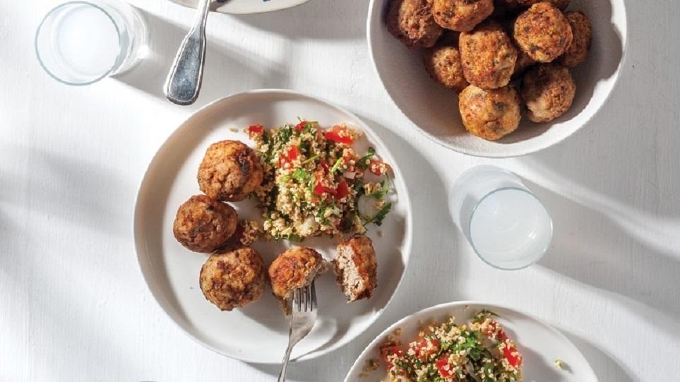 Για τους κεφτέδες: Σε μια μεγάλη μπασίνα ζυμώνουμε καλά όλα τα υλικά και αφήνουμε το μείγμα σκεπασμένο στο ψυγείο για 1 ώρα να ξεκουραστεί και να βγουν όλες οι γεύσεις των υλικών.