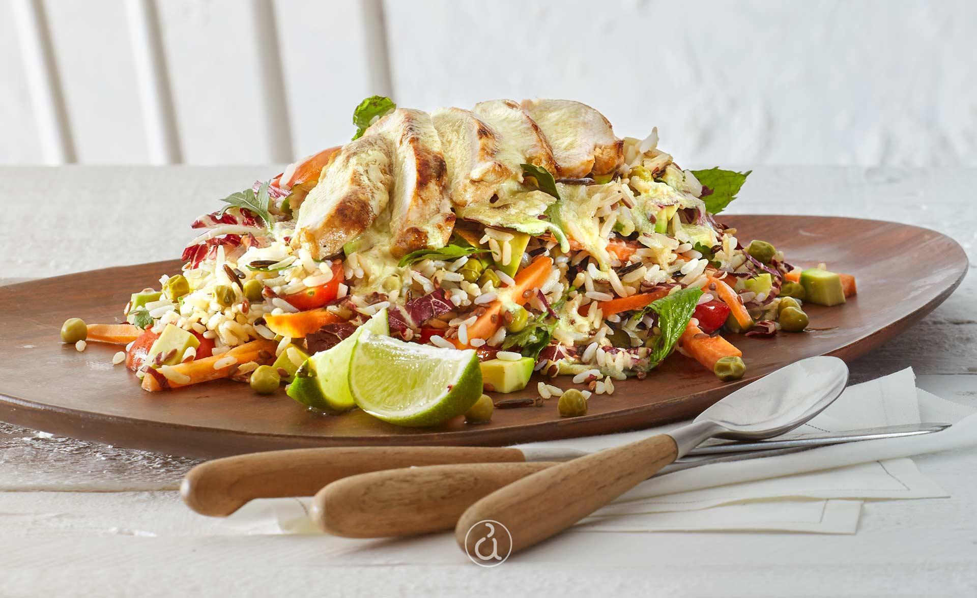 Bάζουμε όλα τα λαχανικά, το ρύζι και τους σπόρους σε μία ανοιχτή σαλατιέρα.