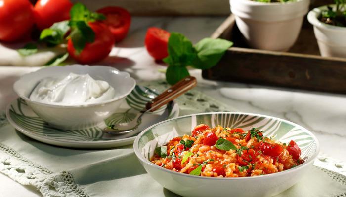 Σε μια φαρδιά κατσαρόλα ζεσταίνουμε 80 ml από το ελαιόλαδο σε μέτρια φωτιά και σοτάρουμε το κρεμμύδι για περίπου 3 λεπτά, μέχρι να μαλακώσει ελαφρώς. Προσθέτουμε το σκόρδο και τον πελτέ και συνεχίζουμε το σοτάρισμα για περίπου άλλο 1 λεπτό, ανακατεύοντας. Ρίχνουμε τα ντοματάκια ολόκληρα, αλατοπιπερώνουμε και ανακατεύουμε.