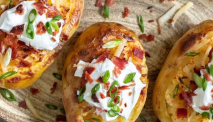 Πλένετε πολύ καλά τις πατάτες και τις στεγνώνετε σε απορροφητικό χαρτί. Χαράζετε στην κάθε πατάτα ένα καπάκι σε σχήμα έλλειψης και αλείφετε τη φλούδα εξωτερικά με λίγο βούτυρο. Τυλίγετε κάθε πατάτα με αλουμινόχαρτο και τις ψήνετε για 1 ώρα στους 180° C – 200° C, μέχρι να μαλακώσουν. Τις βγάζετε από το φούρνο και, μόλις κρυώσουν λίγο, αφαιρείτε το καπάκι και αδειάζετε αρκετή από τη σάρκα τους.