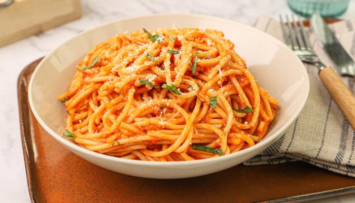 Βάζετε σε μια κατσαρόλα αρκετό νερό να βράσει. Ρίχνετε τα σπαγκέτι, τα αφήνετε να δράσουν και στραγγίζετε.