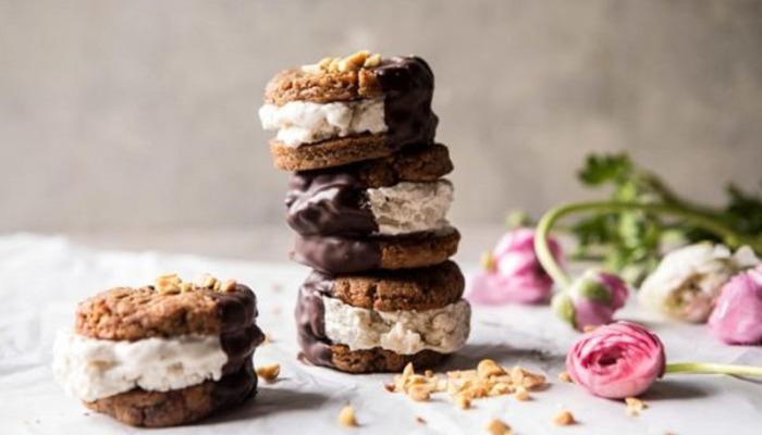 Φροντίζετε τα επάνω μπισκότα να είναι στην ίδια φορά και στο ίδιο σημείο με τα κάτω μπισκότα για να κόβονται καλά οι μερίδες σάντουϊτς. Το βάζετε πάλι στη κατάψυξη για τουλάχιστον 5 ώρες, ιδανικά για όλο το βράδυ. Ξεφορμάρετε το κόβετε σε μικρά σαντουϊτσάκια και σερβίρετε.