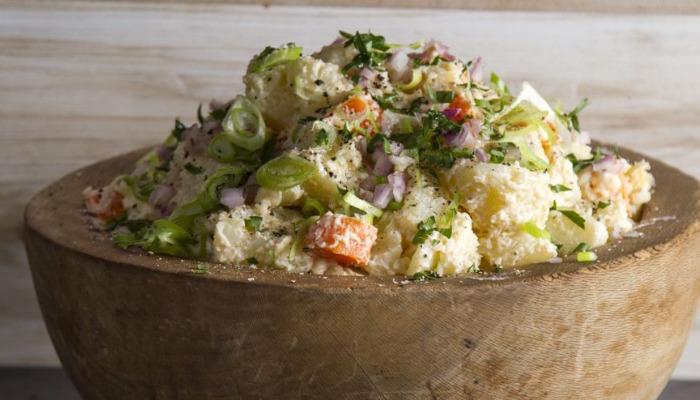Ρίχνουμε στις πατάτες τα υπόλοιπα λαχανικά και το μείγμα γιαουρτιού.Ανακατεύουμε καλά πιέζοντας ταυτόχρονα τις πατάτες. Συμπληρώνουμε με αλατοπίπερο ή χυμό λάιμ και τοποθετούμε στο ψυγείο μέχρι να κρυώσει καλά.