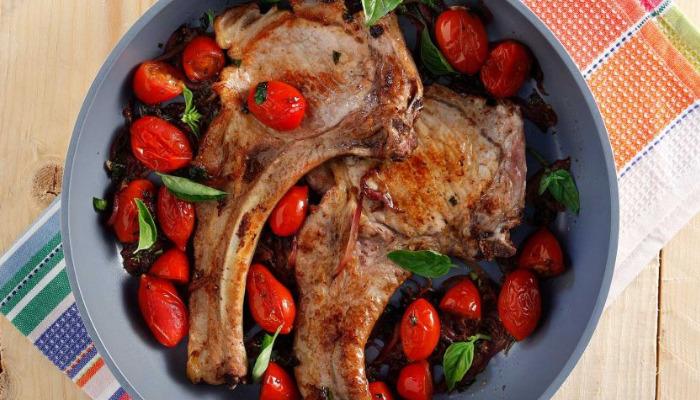 Αποσύρουμε τις μπριζόλες από το τηγάνι και τις βάζουμε σε ένα πιάτο, σκεπασμένες.Βάζουμε στο τηγάνι το υπόλοιπο ελαιόλαδο, το κρεμμύδι και το σκόρδο και τα σοτάρουμε σε δυνατή φωτιά για περίπου 1 λεπτό, μέχρι να μαλακώσουν, «ξύνοντας» με ξύλινη κουτάλα τα πλαϊνά του τηγανιού ώστε να πάρουμε τα νόστιμα γλάσα που έχουν αφήσει οι μπριζόλες στο τηγάνι. Ρίχνουμε τα ντοματίνια, το βαλσαμικό και αλατοπίπερο.
