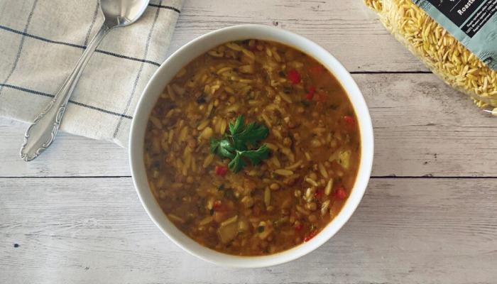 Στο μεταξύ σε ένα βαθύ τηγάνι σοτάρετε στο ελαιόλαδοτο σκόρδο, το κρεμμύδι και το ψιλοκομμένο λουκάνικο και προσθέτετε τον ντοματοπελτέ. Ρίχνετε τα υλικά από το τηγάνι στην κατσαρόλα με το ζωμό και τις φακές, προσθέτοντας και το κοφτό μακαρονάκι.