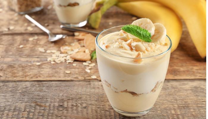 Γαρνίρετε με ψιλοκομμένες μπανάνες και βάζετε τα ποτήρια για 2 με 3 ώρες στο ψυγείο. Μόλις κρυώσει το γλυκάκι σας είναι έτοιμο.