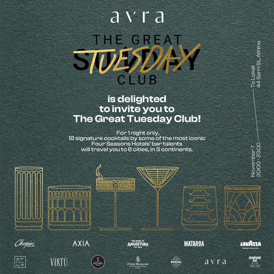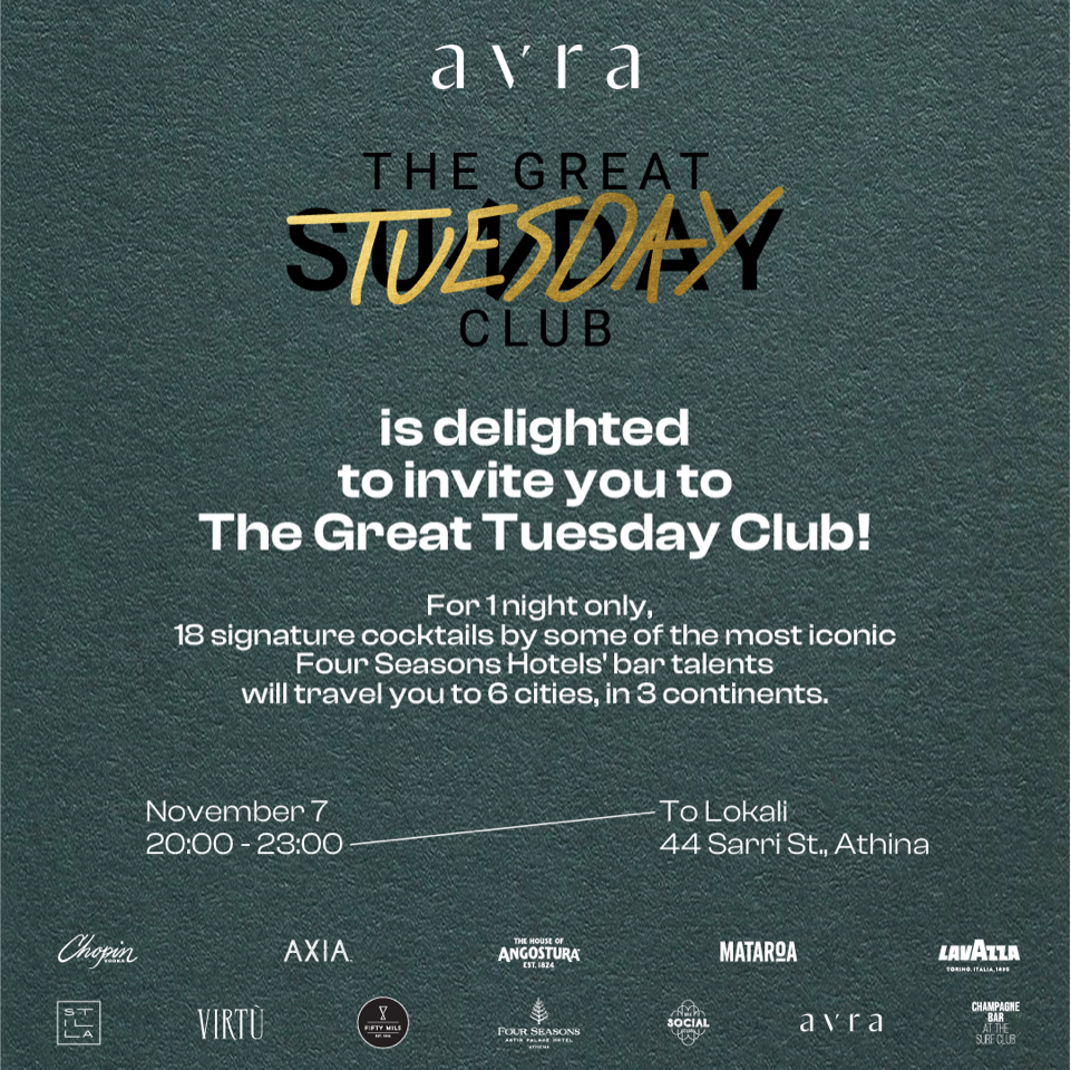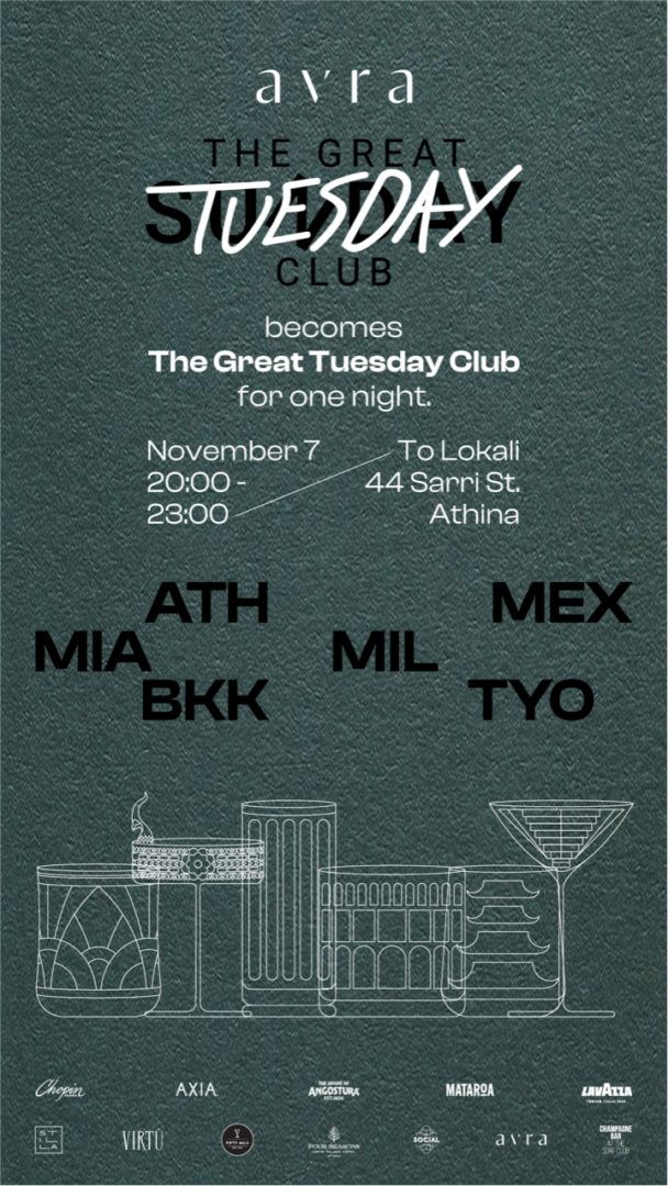 Για να ανακαλύψετε έξι μπαρ από τρεις ηπείρους στο αποκλειστικό event του Avra’s Great Tuesday Club, ακολουθήστε το @avra_athens στο Instagram.