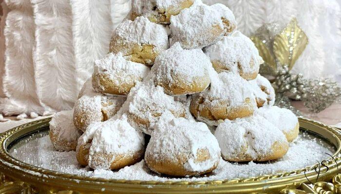 Βγάζουμε από τον φούρνο, αφήνουμε για 5 λεπτά και πασπαλίζουμε με ζάχαρη άχνη να καλυφθούν.