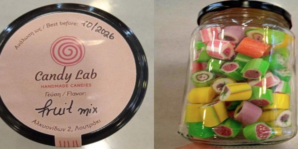 - Καραμέλες «Fruit Mix»: Συσκευασία 230g, της εταιρείας «Candy Lab» (Λουτράκι Κορινθίας), με ημερομηνία ανάλωσης έως 10/2026.