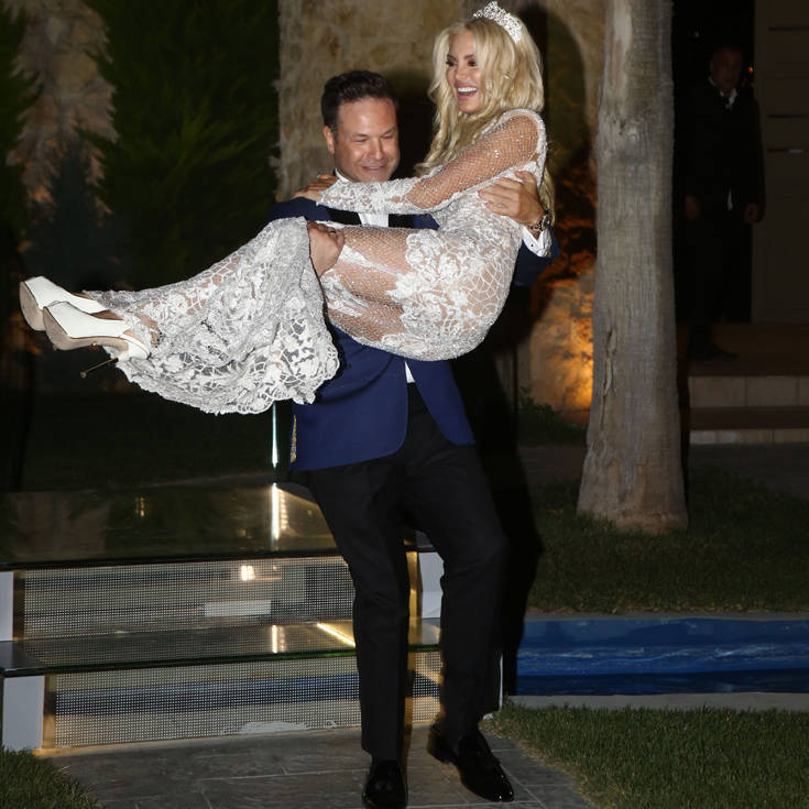 Η νύφη απαστράπτουσα έφτασε στην εκκλησία συνοδευόμενη από τον πατέρα της Θανάση Παναγιώταρο ενώ το νυφικό που επέλεξε ήταν δημιουργία της κουμπάρας του ζευγαριού Άννας Βενέτη. Το κοστούμι του γαμπρού επιμελήθηκε ο οίκος Papadogamvros.