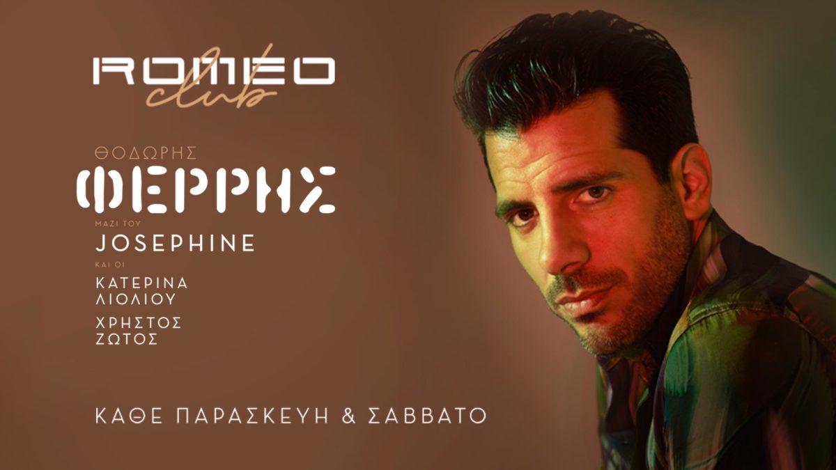 Ένας από τους πιο ταλαντούχους τραγουδιστές της νέας γενιάς, ο Θοδωρής Φέρρης έρχεται να δώσει το πρώτο του καλοκαιρινο ραντεβού με το κοινό και υπόσχεται ένα μοναδικό πρόγραμμα που θα γίνει σίγουρα talk of the town! Θα μας παρασύρει σε αγαπημένα μουσικά μονοπάτια που θα μας ξεσηκώσουν από την πρώτη κιόλας στιγμή στον no1 προορισμό για το καλοκαίρι, το Romeo Club!