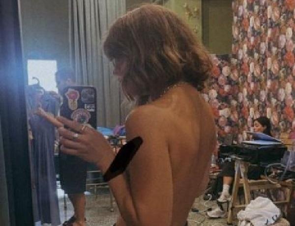 Φαίνεται η πλάτη της, φορά μια ριγέ φούστα και φωτογραφίζεται μπροστά από τον καθρέφτη της.