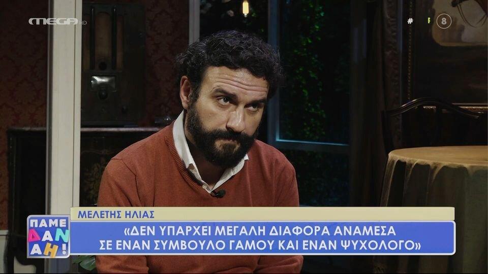 Στη συνέχεια της συνέντευξής του Μελέτης Ηλίας δήλωσε πως κάνει ψυχοθεραπεία: «Δεν υπάρχει μεγάλη διαφορά ανάμεσα σε έναν σύμβουλο γάμου και έναν ψυχολόγο. Ο σύμβουλος γάμου είναι ένας ψυχολόγος που δέχεται στη θεραπεία του ένα ζεύγος, αντί για τη μονάδα. Είναι κάτι σαν δυαδική ψυχοθεραπεία, που θα πρέπει όμως να συνδυάζεται και με ατομική. Εγώ κάνω ακόμα ψυχοθεραπεία».