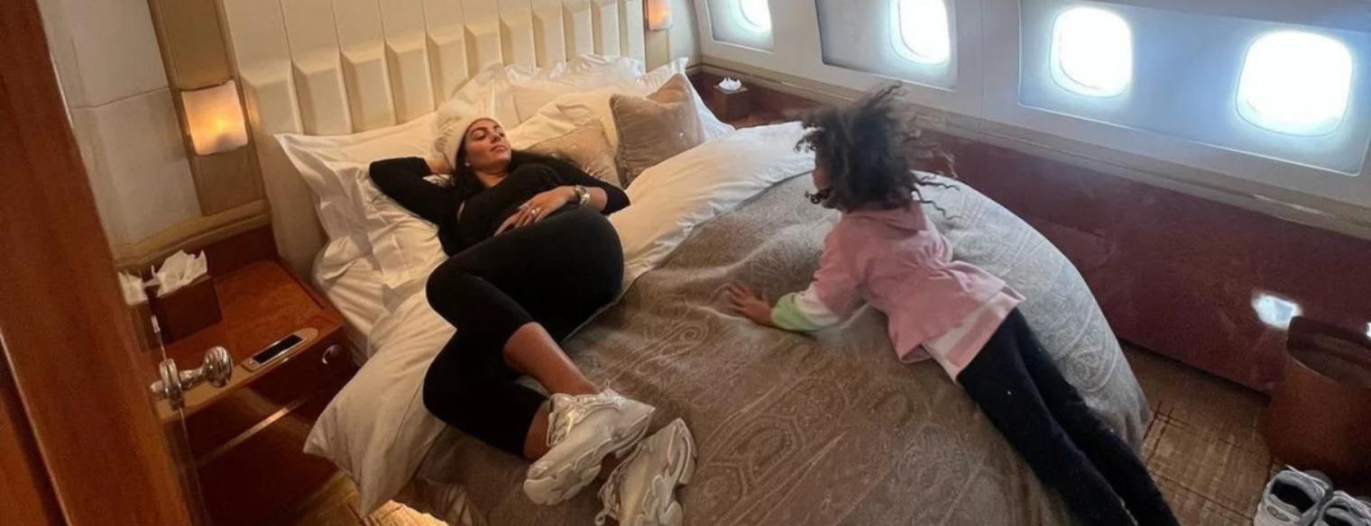 Η Χεορχίνα Ροντρίγκεζ πόσταρε εικόνες που δείχνουν ένα θεόρατο διπλό κρεβάτι, με την 28χρονη να ποζάρει ξαπλωμένη σε αυτό, ενώ η κόρη της, Αλάνα, πηδάει πάνω του. Το μοντέλο ανάρτησε κι άλλα στιγμιότυπα με την ίδια να είναι ντυμένη πολύ απλά με ένα μαύρο κολάν και μαύρο τοπ, αλλά φρόντισε να επιδείξει τα πανάκριβα δαχτυλίδια και κολιέ που φορούσε, καθώς και ένα εντυπωσιακό χρυσό ρολόι.