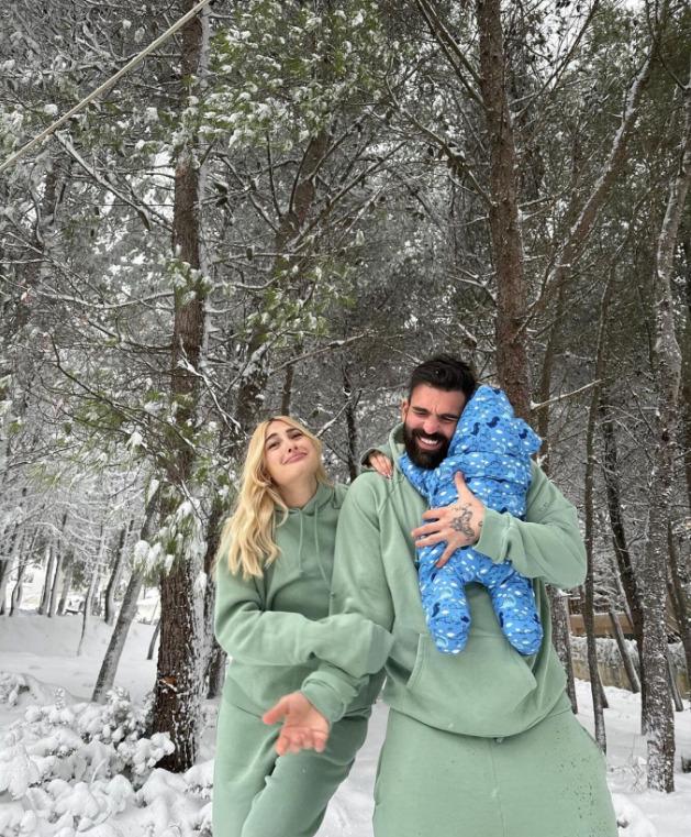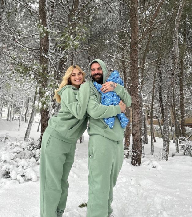 Ο Δημήτρης Αλεξάνδρου κρατά στην αγκαλιά του τον γιο τους, που ήρθε στη ζωή τον περασμένο μήνα και η Ιωάννα Τούνη στέκεται δίπλα του, ποζάροντας χαμογελαστή στον φωτογραφικό φακό.