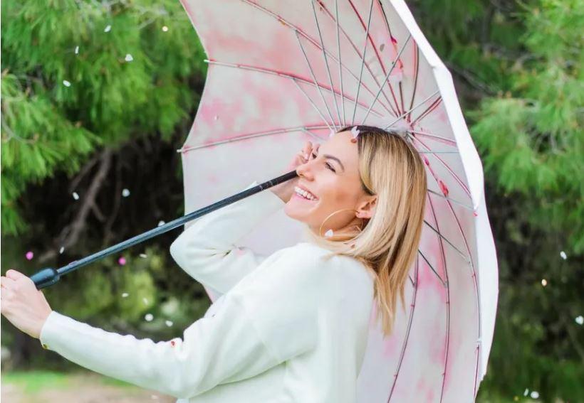 Στα στιγμιότυπα που δημοσίευσε, εμφανίζεται η ίδια να κρατά μία ροζ ομπρέλα χαμογελαστή, ενώ διάφορα κομφετί σε σχήμα καρδιάς και λευκά πούπουλα πετούν στον αέρα, όλα σε ροζ απόχρωση.
