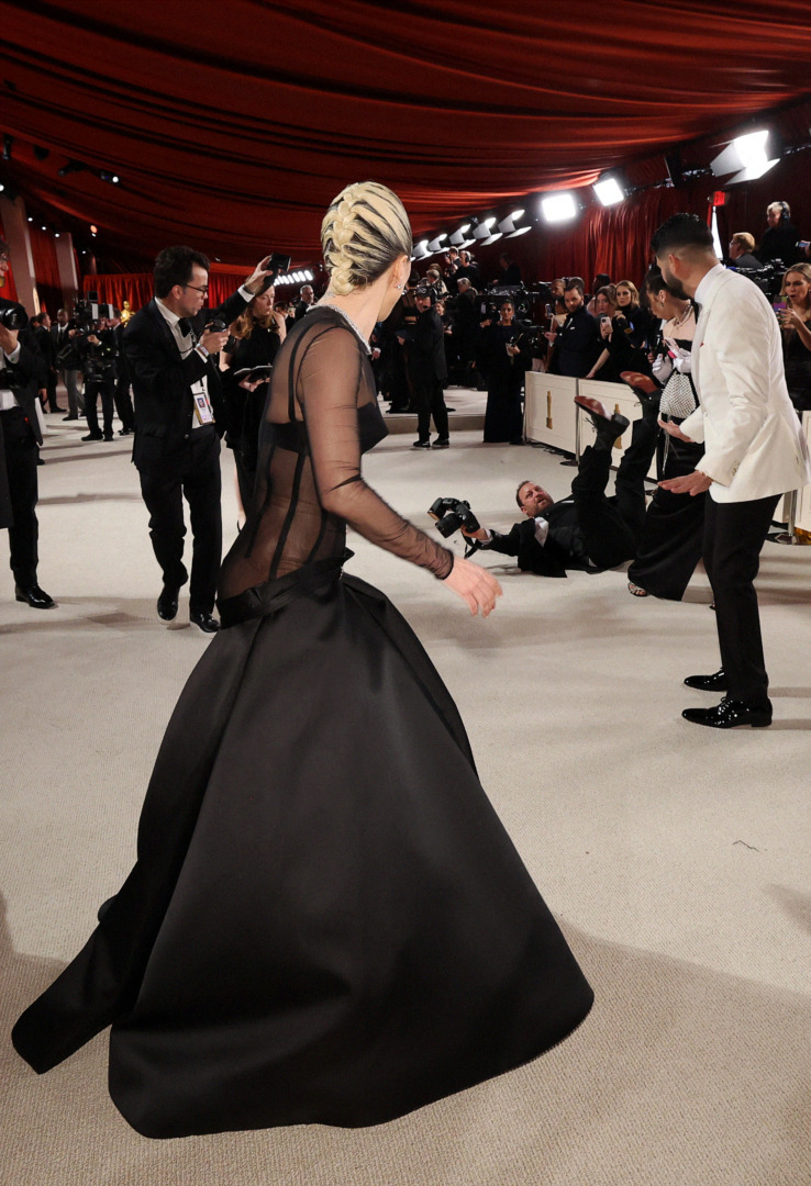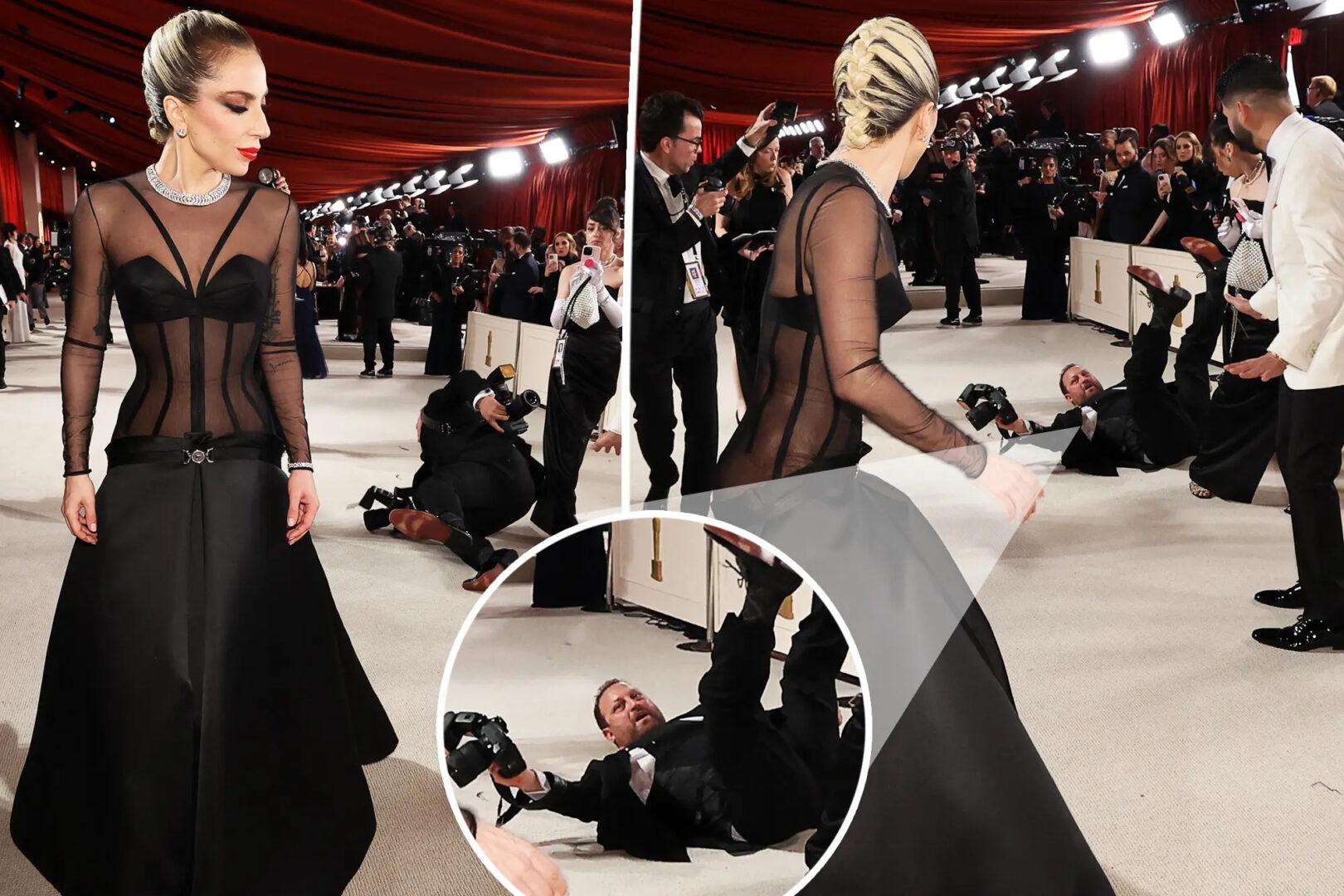 Το περιστατικό συνέβη καθώς ο φωτογράφος προσπαθούσε να τραβήξει από κοντά το εντυπωσιακό φόρεμα της Lady Gaga για τα Όσκαρ. Ενώ προσπαθούσε να την προσπεράσει, σκόνταψε και έπεσε. Χωρίς δισταγμό, η Lady Gaga γύρισε γρήγορα και έτρεξε να βοηθήσει τον άνδρα να σταθεί στα πόδια του.