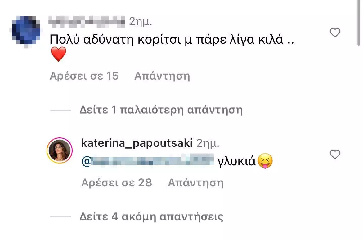 «Πολύ αδύνατη κορίτσι μου πάρε λίγα κιλά», ήταν το σχόλιο με την Κατερίνα Παπουτσάκη να απαντά: «γλυκιά» βάζοντας ένα emoji
