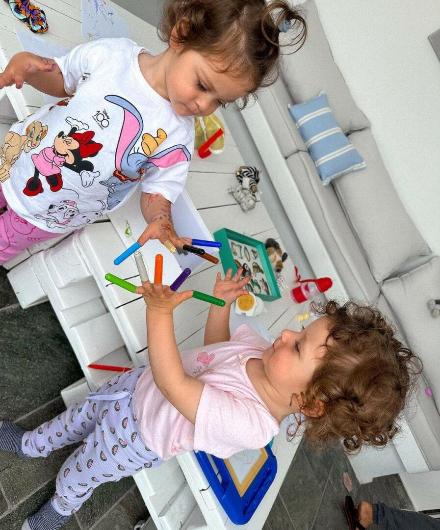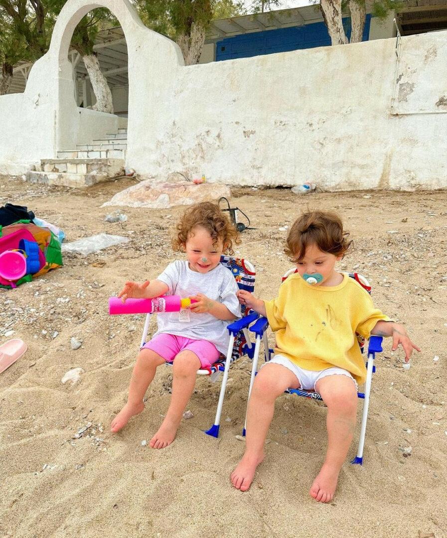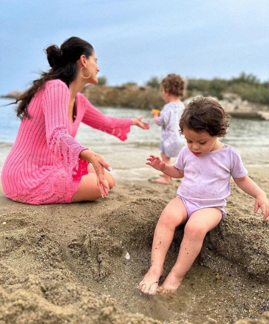 Οι μικρές εκτός από τις βόλτες στη θάλασσα και τα παιχνίδια στην άμμο ακολουθούν το ίδιο πρόγραμμα και τη ρουτίνα που έχουν και στην Αθήνα. Ζωγραφική, παιχνίδια και παιδική χαρά. Μάλιστα στην παιδική χαρά, η μαμά τους, βρήκε χρόνο να γυμναστεί κιόλας.