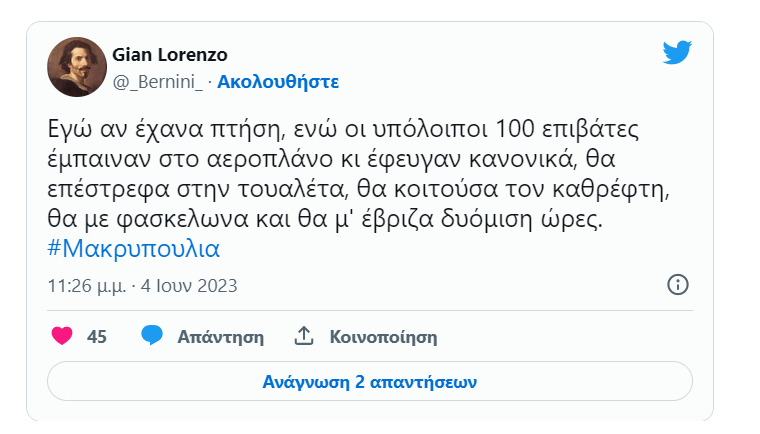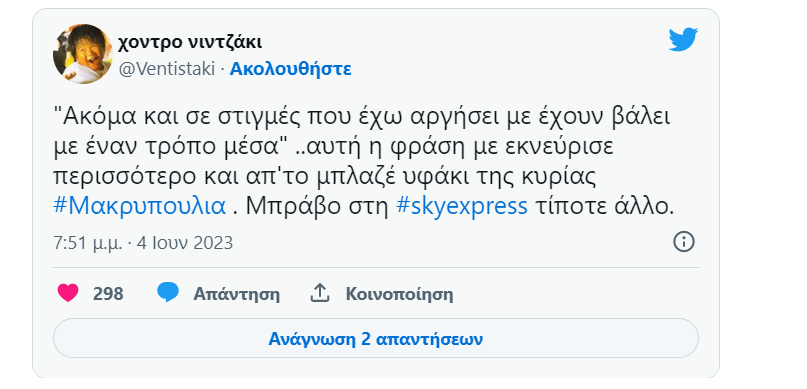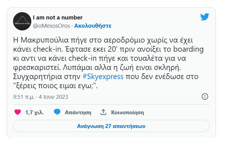 «Όταν κατέβηκα κάτω, λέω ας πάω και λίγο στην τουαλέτα 1′ να μην το έχω κι αυτό στο νου μου. Φτάνω λοιπόν, στο check in κι ήταν άδειο. Ήταν δύο κοπέλες που δεν είχαν και πρόθεση να βοηθήσουν. Λέω παρακαλώ για τη Σάμο;. Μου λένε το χάσατε, έπρεπε να ήσασταν εδώ 20′ πριν” λέω μα είμαι 20′ πριν εδώ. Όχι, είναι και 43′ μου απαντούν, έχετε αργήσει 3′ ολόκληρα λεπτά Λέω κάνατε κάποια ανακοίνωση; Γιατί δεν άκουσα κάτι. Ήμουν στο αεροδρόμιο, απλά είχα μπει στην τουαλέτα» ανέφερε, μεταξύ άλλων η Ζέτα Μακρυπούλια.