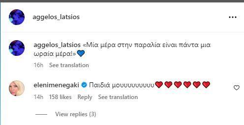 Στη μία από τις δύο απεικονίζεται ο ίδιος να ποζάρει για τον φωτογραφικό φακό, επιδεικνύοντας τους καλογυμνασμένους κοιλιακούς και τα μπράτσα του κάτω από τον ήλιο ενώ στη δεύτερη ο Άγγελος παίζει με τη μικρή Μαρίνα στην άμμο κάνοντάς την να γελάει.