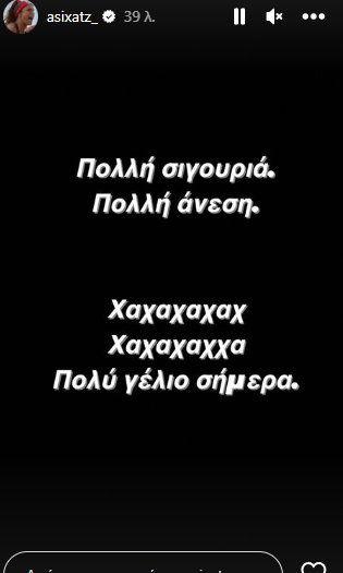 «Χαχαχα ρε παιδιά πολλή δικαιοσύνη έχει πέσει τελευταία. Είναι ψιλά γράμματα η λέξη «δικαιοσύνη». Ας μείνουμε μόνο στη λέξη λαμογιά. Πολλή σιγουριά, πολλή άνεση. Χαχαχα πολύ γέλιο σήμερα. Πάμε ένα replay την ίδια σιγουριά για τη δυάδα τώρα» έγραψε μεταξύ άλλων η Ασημίνα Χατζηανδρέου.