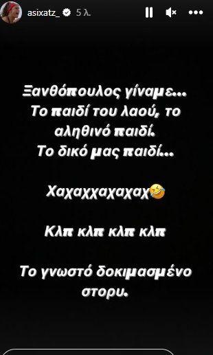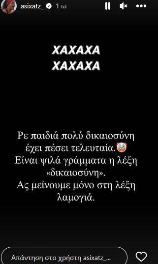«Χαχαχα ρε παιδιά πολλή δικαιοσύνη έχει πέσει τελευταία. Είναι ψιλά γράμματα η λέξη «δικαιοσύνη». Ας μείνουμε μόνο στη λέξη λαμογιά. Πολλή σιγουριά, πολλή άνεση. Χαχαχα πολύ γέλιο σήμερα. Πάμε ένα replay την ίδια σιγουριά για τη δυάδα τώρα» έγραψε μεταξύ άλλων η Ασημίνα Χατζηανδρέου.
