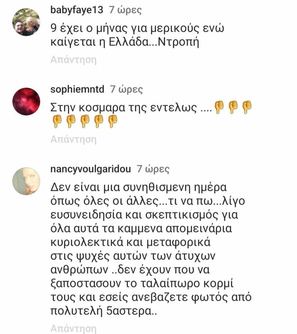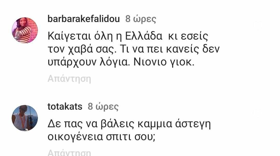 Έτσι, πέρα από τα θετικά σχόλια που δέχθηκε όσον αφορά τη σχέση της με τον Βασίλη Μπισμπίκη και το πόσο καλλίγραμμο είναι το σώμα της, η Δέσποινα Βανδή ούτε λίγο ούτε πολύ κατηγορήθηκε από κάποιους followers της πως δημοσιεύοντας τις «χλιδάτες» διακοπές της δεν δείχνει καθόλου ενσυναίσθηση για τους συνανθρώπους της και όσους πάλευαν για να σβήσουν τις φωτιές.