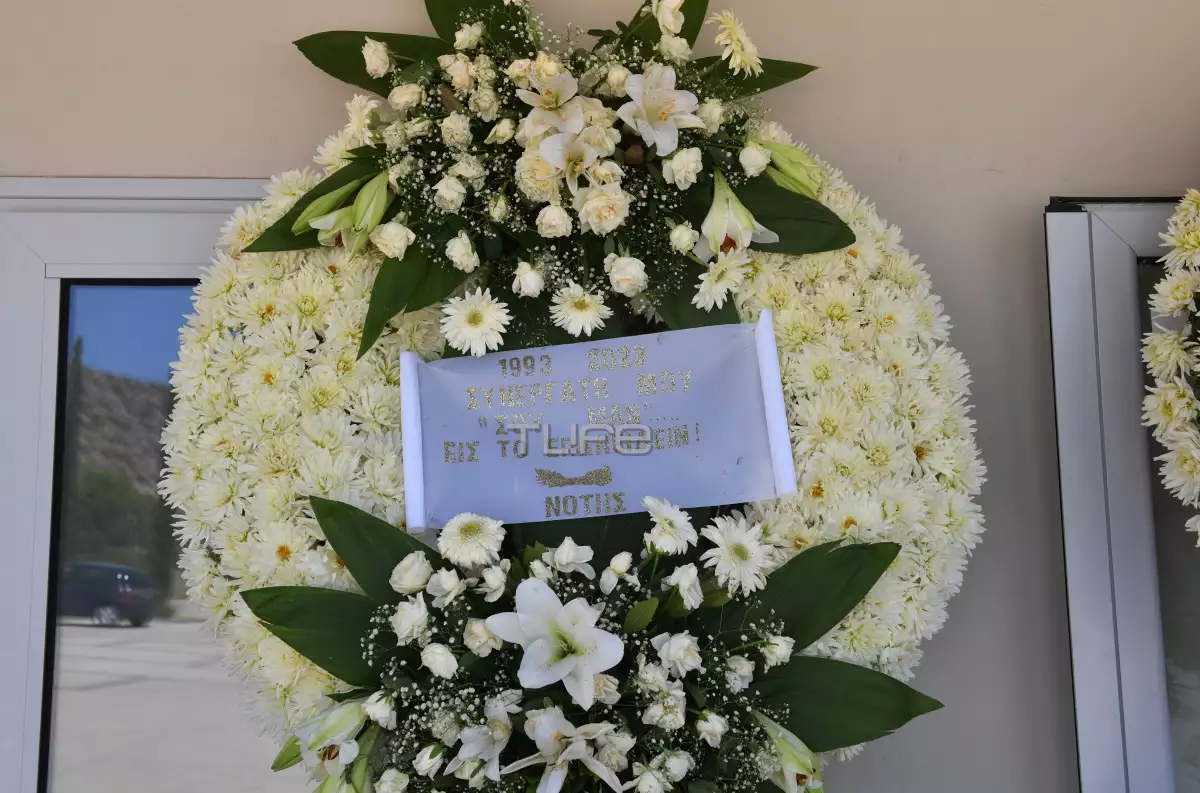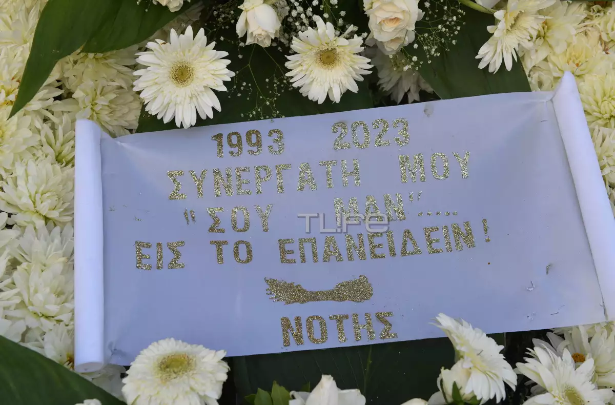 «1993-2023. Συνεργάτη μου. “Σου μαν”… Εις το επανιδείν. Νότης» έγραφε πάνω στο στεφάνι που έστειλε ο Νότης Σφακιανάκης.