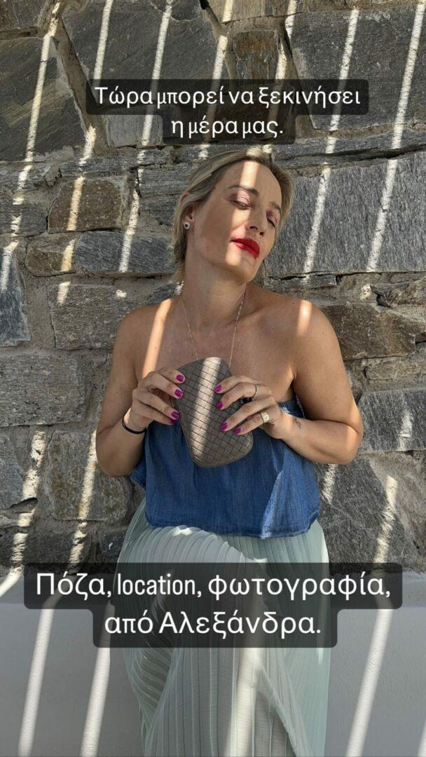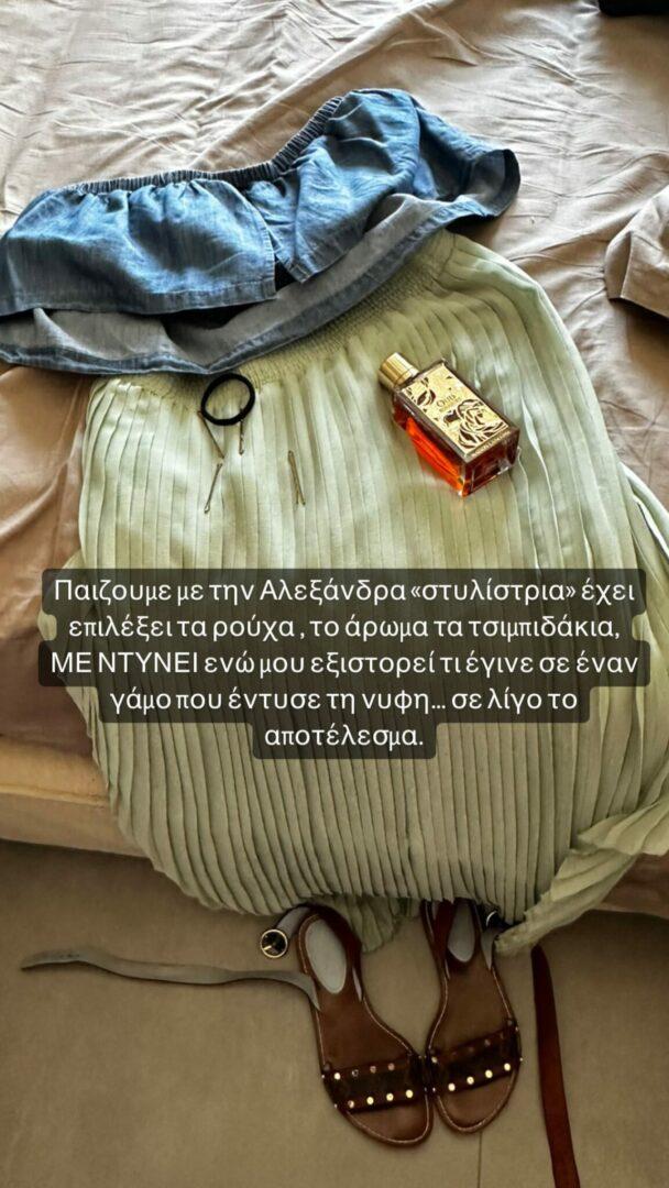 «Παίζουμε με την Αλεξάνδρα “στυλίστρια”. Έχει επιλέξει τα ρούχα, το άρωμα, τα τσιμπιδάκια, με ντύνει ενώ μου εξιστορεί τι έγινε σε ένα γάμο που έντυσε τη νύφη… Σε λίγο τα αποτελέσματα», έγραψε στο πρώτο στόρυ του Get ready with me, η Ελεονώρα Μελέτη.