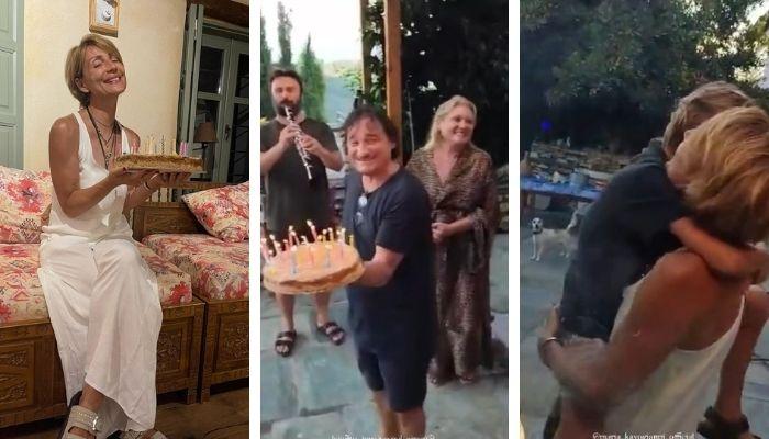Ο Βασίλης Χαραλαμπόπουλος κρατώντας μια τούρτα γενεθλίων βγήκε στην αυλή του σπιτιού του και με την Μαρία Καβογιάννη, τη Λίνα Πρίντζου και τους υπόλοιπους εκλεκτούς καλεσμένους της τραγούδησαν το γενέθλιο κομμάτι.