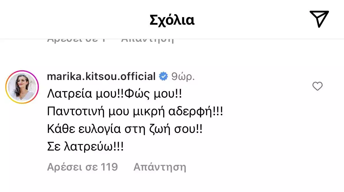 Ανάμεσα στα σχόλια κάτω από την ανάρτηση και οι ευχές της Μαρίας Κίτσου με την οποία η Δανάη Μιχαλάκη συνυπήρχαν μαζί ως αδερφές Σταμίρη για την πετυχημένη σειρά του ANT1, Άγριες Μέλισσες.