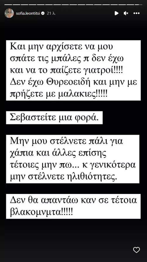 «Δεν ξέρω γιατί κάνω αυτό το στόρι. Ίσως επειδή είναι αλήθεια, είμαι στενοχωρημένη, θέλω να το μοιραστώ γιατί ελπίζω πως θα έρθει η μέρα που όλα αυτά τα στόρι, ίσως αποτελέσουν μία κινητήριο δύναμη για κάποιον άλλον που θα έχει λυγίσει, όπως νιώθω σίγουρα εγώ. Εχθές 80 κιλά και σήμερα ένα κιλό πάνω, με τόσο αγώνα και τόση προσπάθεια. Τώρα πρέπει να σηκωθώ και συνεχίσω με αυτή τη σκ@τ@ ψυχολογία», έγραψε, μεταξύ άλλων η Σοφία Λεοντίτση.