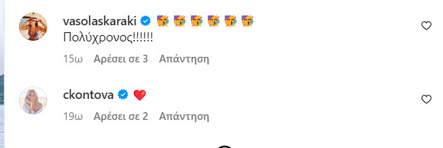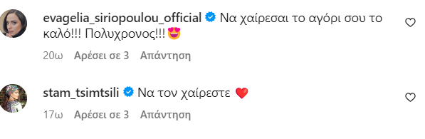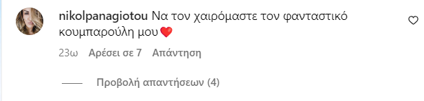 H κουμπάρα του ζευγαριού, Νικόλ Παναγιώτου ήταν από τους πρώτους που σχολίασαν το post της ηθοποιού γράφοντας: «Να τον χαιρόμαστε τον φανταστικό κουμπαρούλη μου».