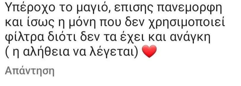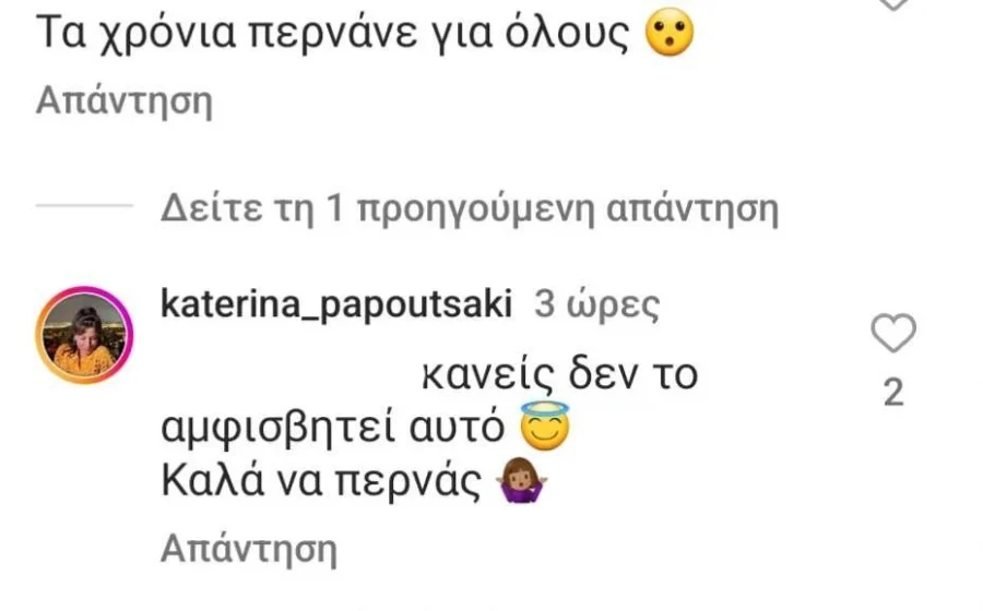 Μια follower σχολίασε το εξής: «Τα χρόνια περνάνε για όλους». Η Κατερίνα Παπουτσάκη, ωστόσο απάντησε με ψυχραιμία σε αυτό το σχόλιο γράφοντας: «Κανείς δεν το αμφισβητεί αυτό. Καλά να περνάς».