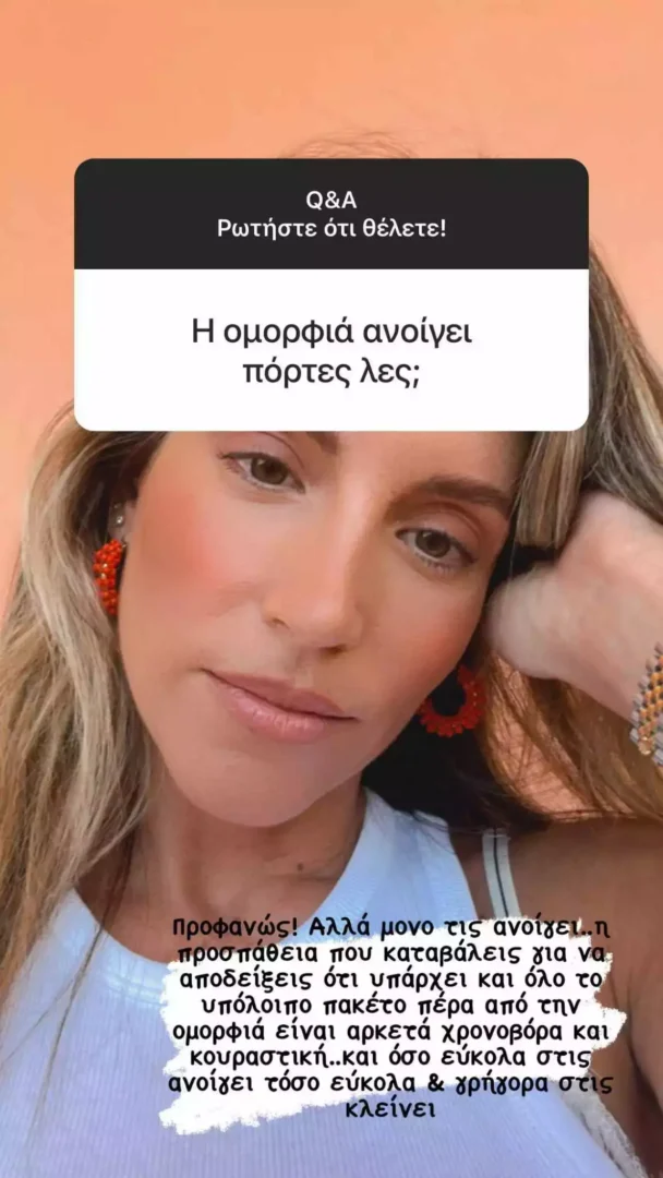«Προφανώς και η ομορφιά ανοίγει πόρτες! Αλλά μόνο τις ανοίγει… η προσπάθεια που καταβάλλεις για να αποδείξεις ότι υπάρχει και όλο το υπόλοιπο πακέτο πέρα από την ομορφιά είναι αρκετά χρονοβόρα και κουραστική… και όσο εύκολα σου τις ανοίγει τόσο εύκολα κα γρήγορα τις κλείνει», τόνισε η ηθοποιός.