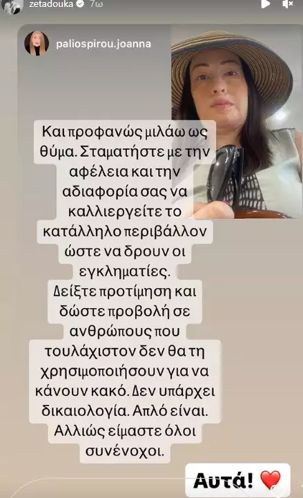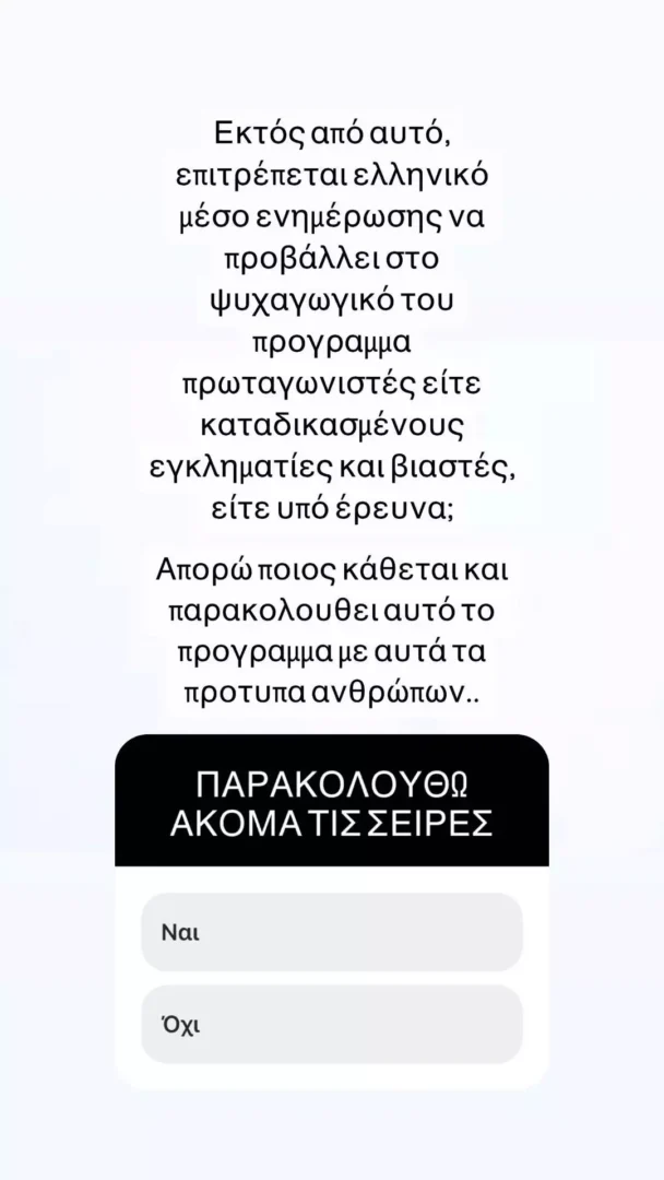 «Ρε παιδιά πείτε μου λίγο γιατί εγώ θα τρελαθώ… 1. Βγαίνει η συγκεκριμένη και στηρίζει έναν άνθρωπο που ασκεί βία σε ανθρώπους; 2. Πηγαίνουν άνθρωποι και χαραμίζουν χρόνο και χρήμα για να δούνε δική του παράσταση; 3. Μας νοιάζει αν είναι καλός σκηνοθέτης ή ηθοποιός από τη στιγμή που καταστρέφει ανθρώπινες ζωές;» έγραψε αρχικά η Ιωάννα Παλιοσπύρου και συνέχισε: «Εκτός από αυτό, επιτρέπεται ελληνικό μέσο ενημέρωσης να προβάλλει στο ψυχαγωγικό του πρόγραμμα πρωταγωνιστές είτε καταδικασμένους εγκληματίες και βιαστές είτε υπό έρευνα; Απορώ ποιος κάθεται και παρακολουθεί αυτό το πρόγραμμα με αυτά τα πρότυπα ανθρώπων».