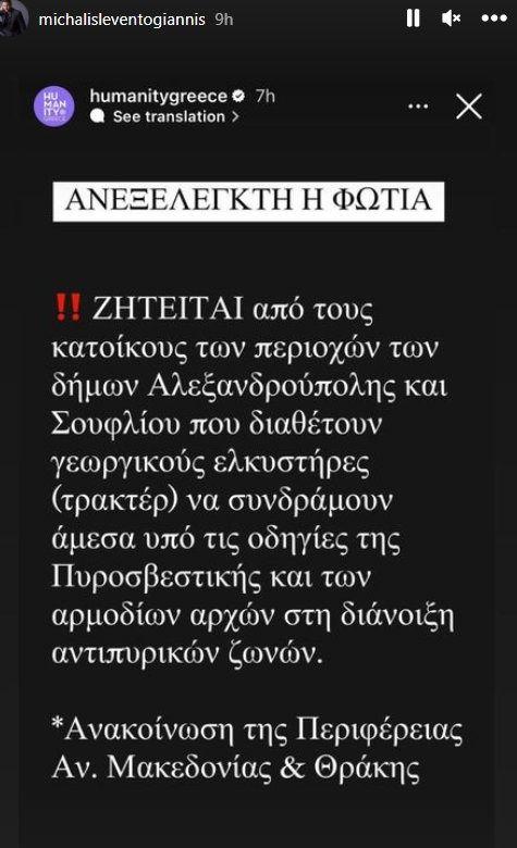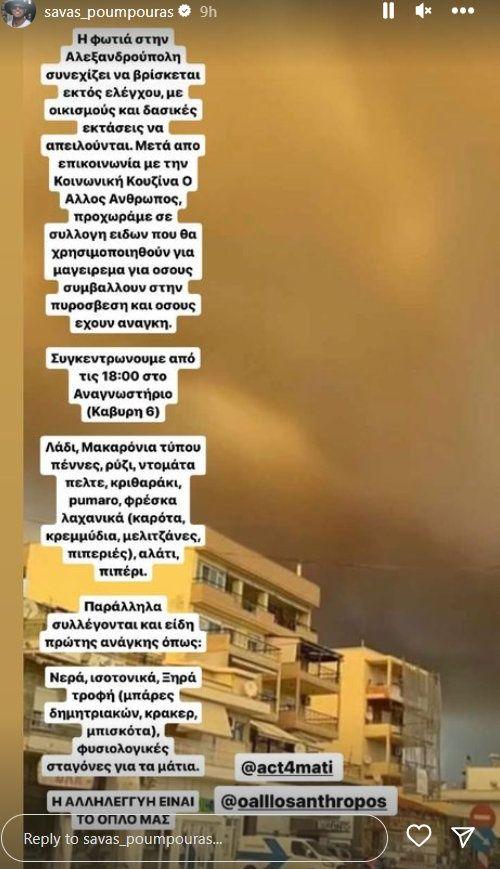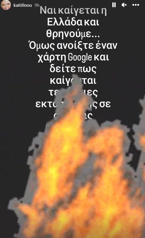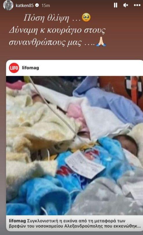 «Καλή δύναμη σε όλους», γράφει η Ασημίνα Χατζηανδρέου. Δεν είναι λίγοι και οι επώνυμοι, οι οποίοι μέσα από τα stories τους κάνουν έκκληση για βοήθεια.