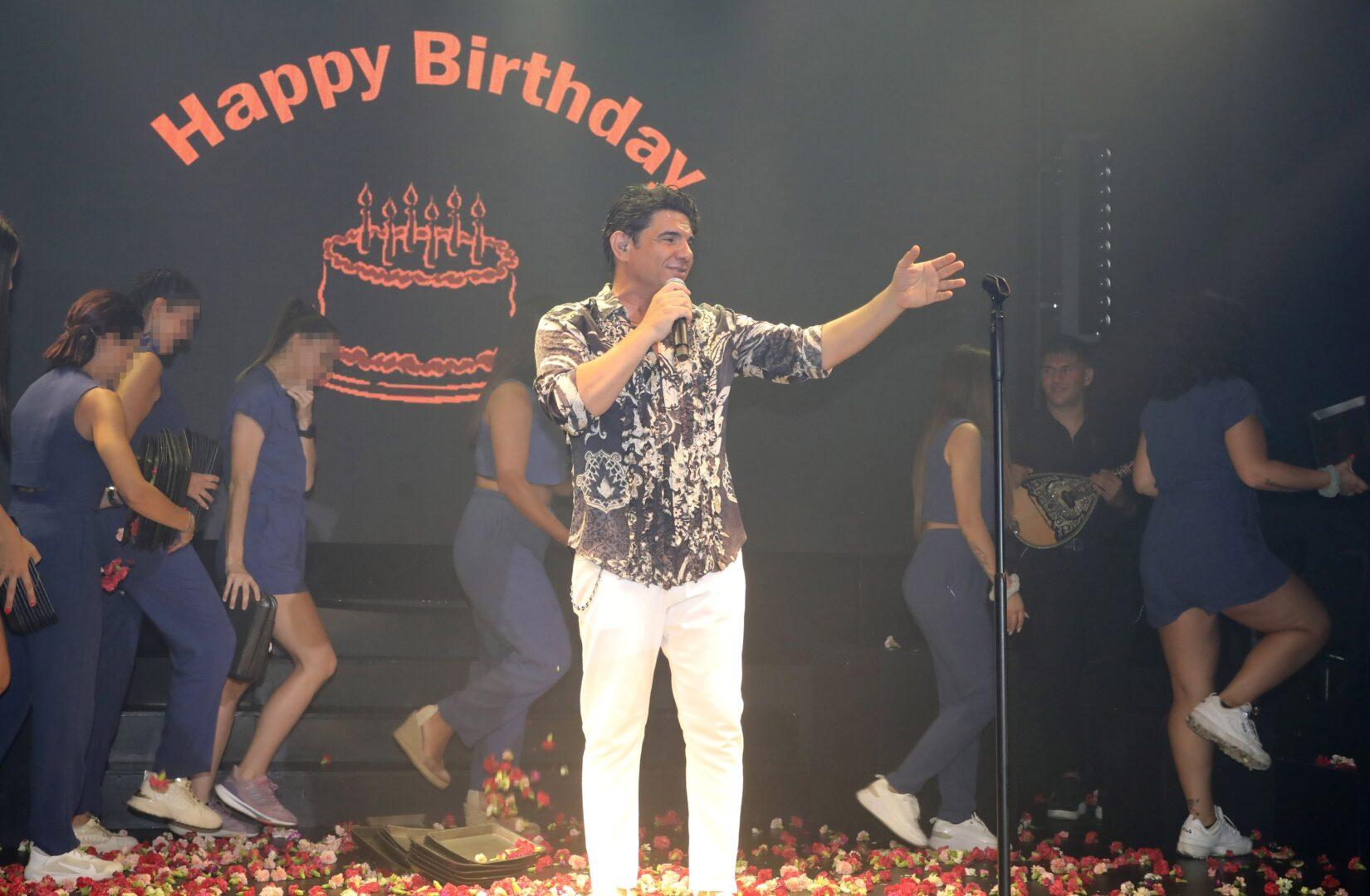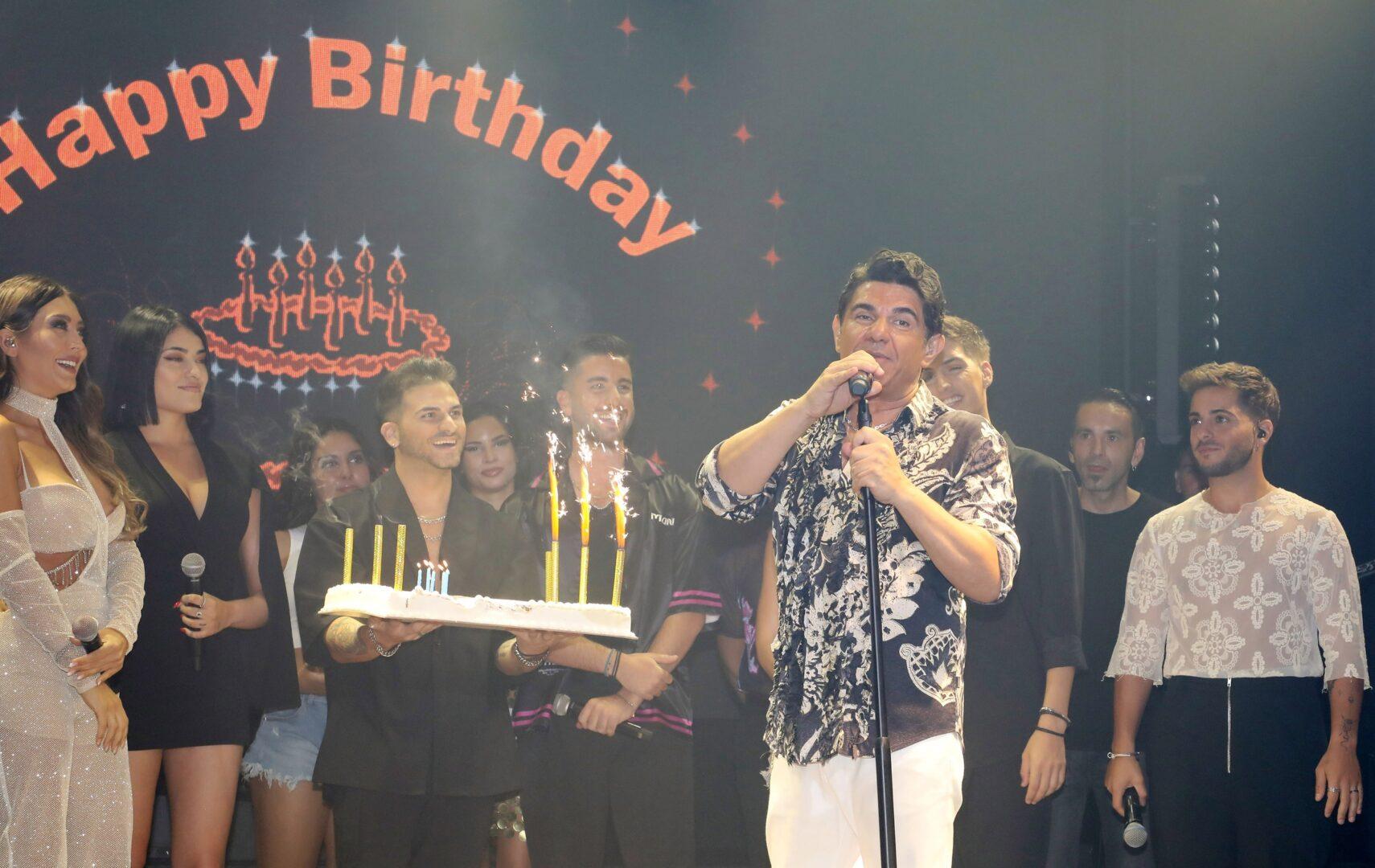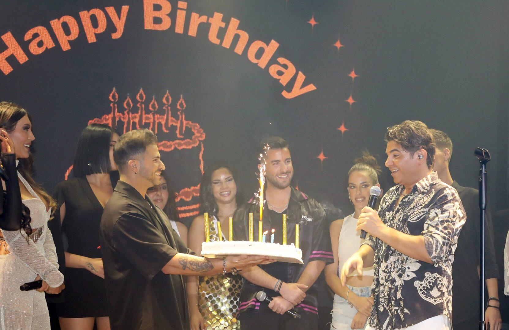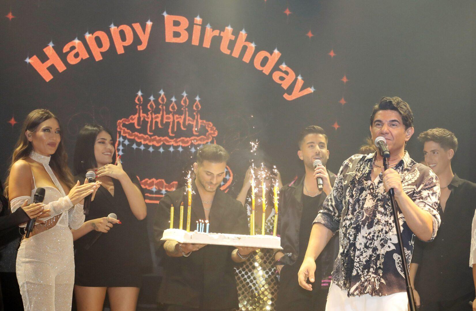Ο Στέλιος Λεγάκης κρατούσε την τούρτα, ενώ όλοι οι τραγουδιστές του σχήματος του είπαν το τραγούδι γενεθλίων και του έδωσαν τις πιο θερμές ευχές τους.