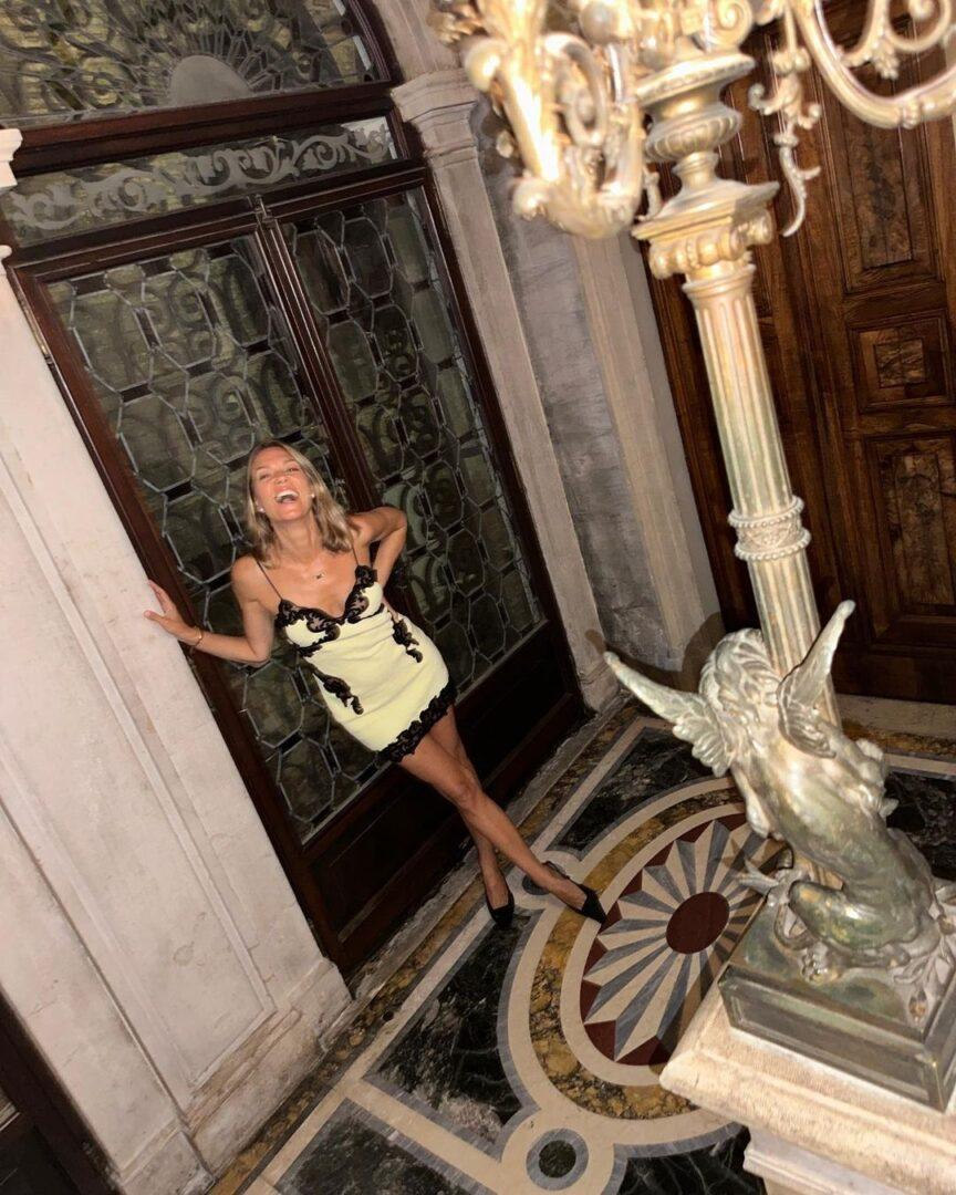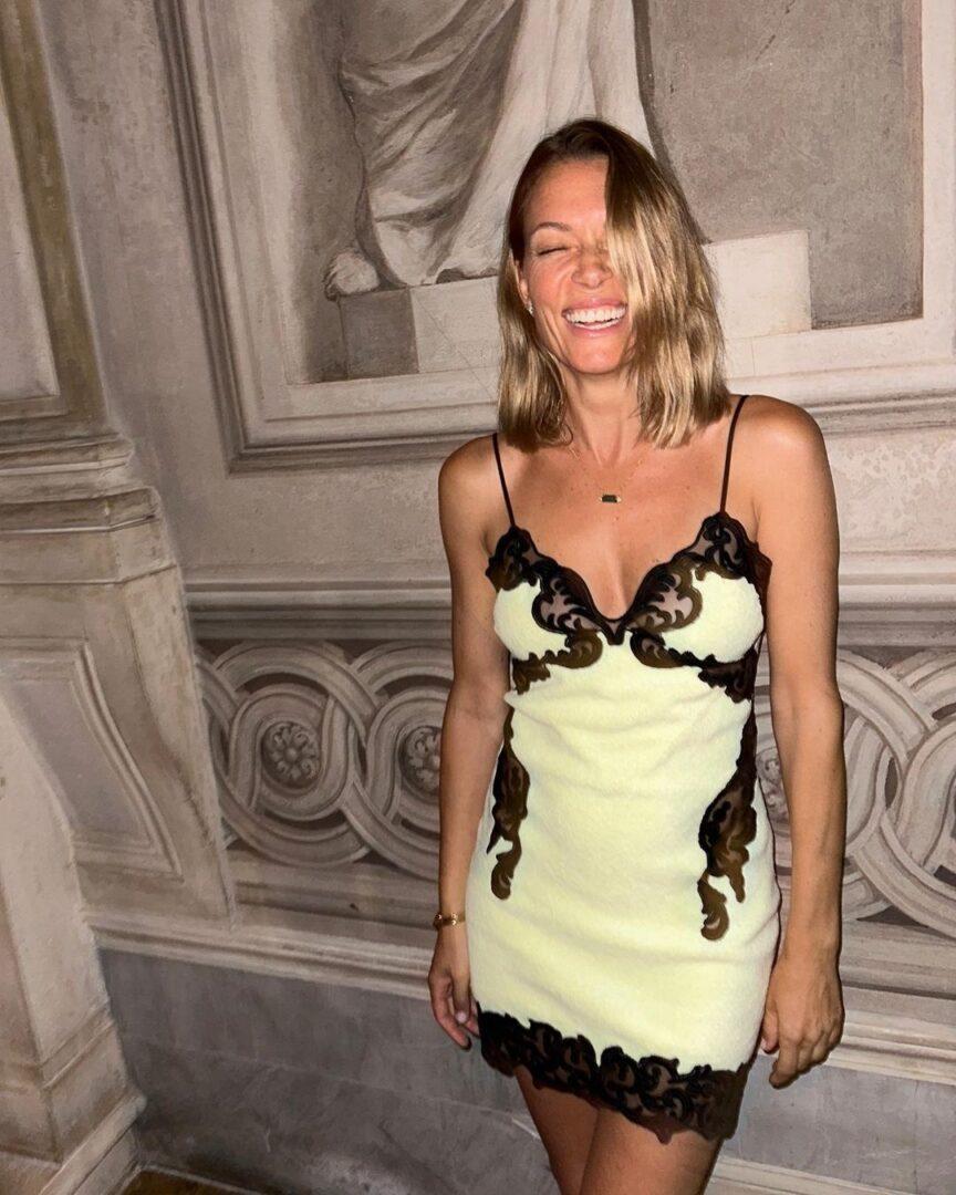 Για την πρώτη της εμφάνιση στη Βενετία, η παρουσιάστρια και πρώην top model επέλεξε ένα μίνι lingerie φόρεμα σε butter yellow απόχρωση με μαύρες λεπτομέρειες από δαντέλα από τον οίκο Αlexander Wang και το συνδύασε με μαύρες slingback γόβες.