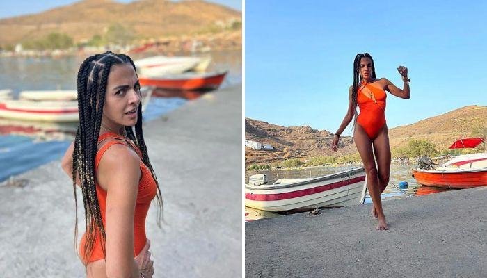 Με πορτοκαλί ολόσωμο μαγιό, η Μαρία Σολωμού ποζάρει στον φακό από μια παραλία του νησιού.