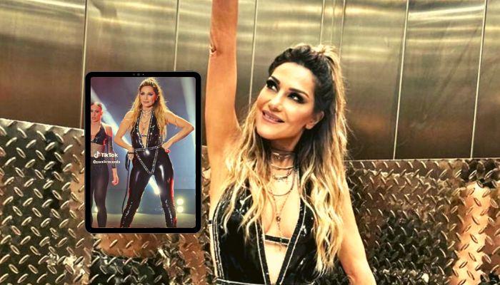 Χθες μάλιστα, η Δέσποινα Βανδή ανέβηκε στη σκηνή φορώντας μια μαύρη ολόσωμη φόρμα με ανοίγματα, δημιουργία της Σίλιας Κριθαριώτη, ενώ κρατούσε κι ένα μαστίγιο στο χέρι.