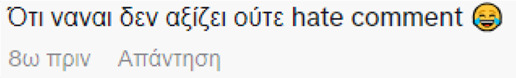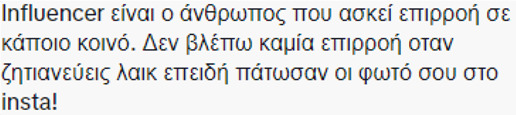 “Influencer είναι ο άνθρωπος που ασκεί επιρροή σε κάποιο κοινό. Δεν βλέπω καμία επιρροή όταν ζητιανεύεις like επειδή πάτωσαν οι φωτό σου στο insta” ήταν ένα από τα σχόλια που δέχτηκε. Κάποιο άλλο μήνυμα έγραφε: “Σε συμπαθούσα μέχρι να κανείς αυτό το βίντεο”.