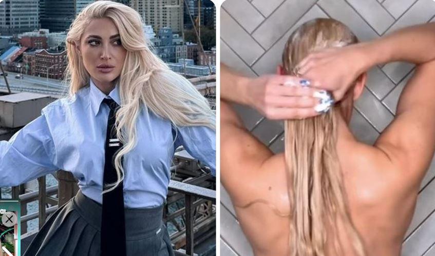 Η ίδια είναι γυμνή στην ντουζιέρα με γυρισμένη πλάτη στην κάμερα και λούζει τα μαλλιά της, ενώ έγραψε: «ASMR + λουσιμο παρέα».