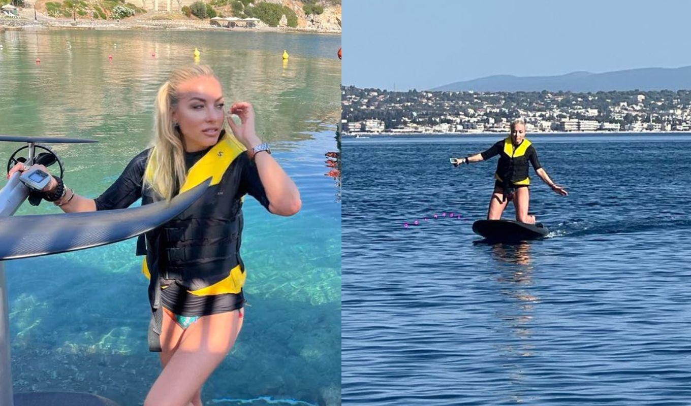 Λατρεύει τα θαλάσσια σπορ και θέλει να δοκιμάζει οτιδήποτε νέο! Γι αυτό άρπαξε την ευκαιρία και έκανε ένα διάλειμμα από τις υποχρεώσεις της στο Λουτράκι για να κάνει το efoil fliteboard που έχει ξετρελάνει μικρούς και μεγάλους.